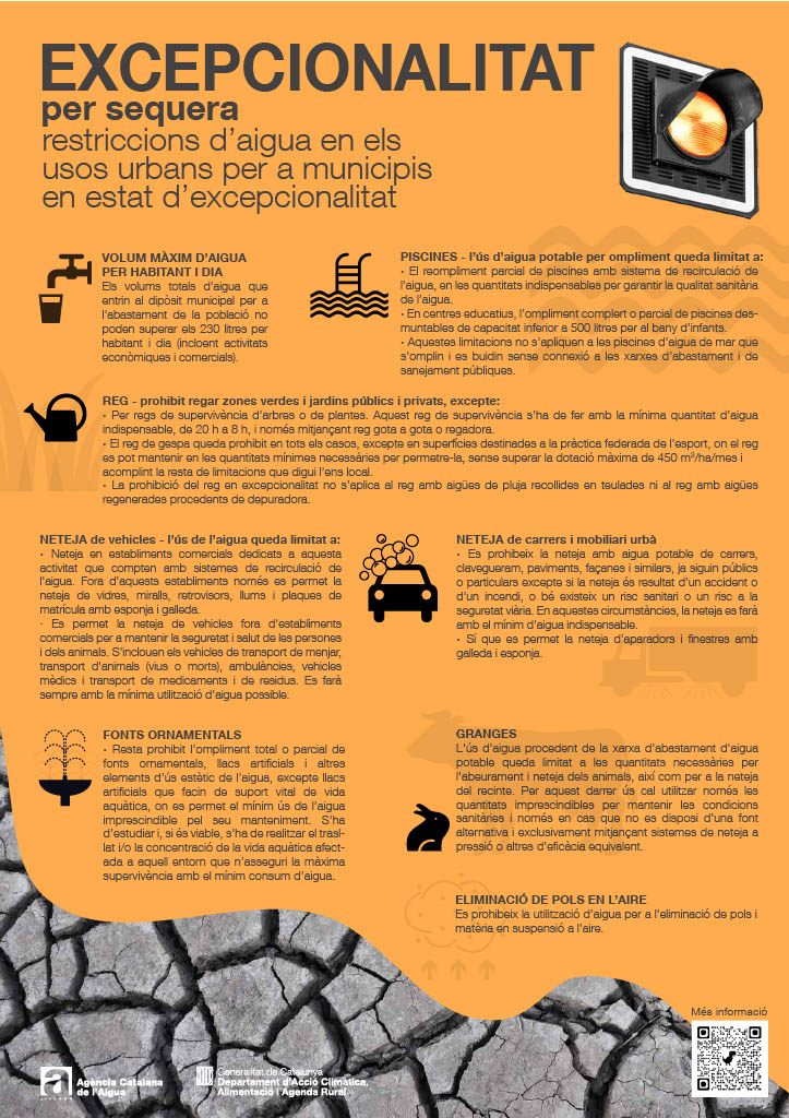 Els municipis que integren la Mancomunitat es troben en situació d’excepcionalitat, pel que fa a la sequera. Això comporta restriccions en l’ús que fem de l’aigua. Són les següents: